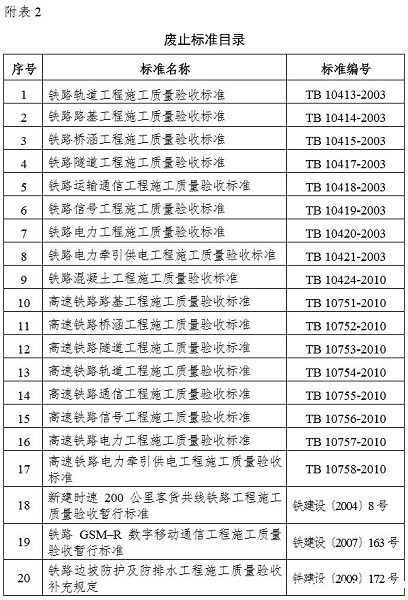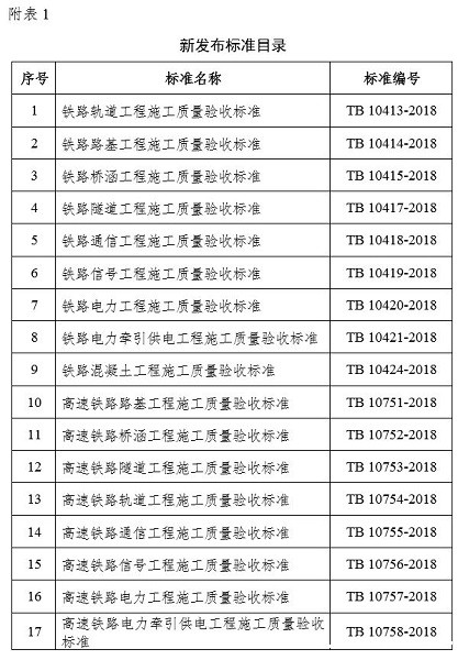 •   现公布《铁路轨道工程施工质量验收标准》(TB 10413-2018)等17项铁路工程建设标准(详见附表1),自2019年2月1日起实施。《铁路轨道工程施工质量验收标准》(TB 10413-2003)等20项铁路工程建设标准(详见附表2)同时废止。