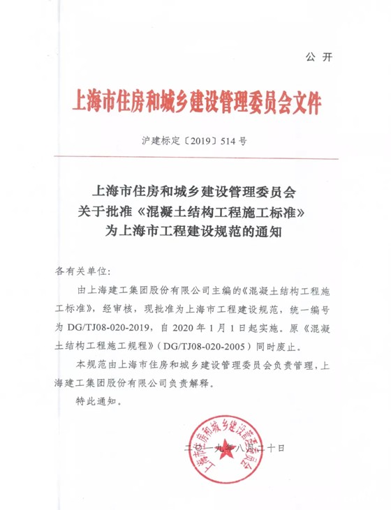 [必威官方首页官网]关于批准《混凝土结构工程施工标准》为上海市工程建设规范的通知 沪建标定(2019)514号