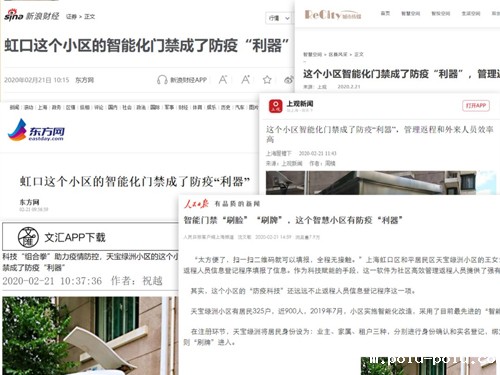 新冠肺炎疫情期间,不少小区在疫区人员排查、内部住户管理、外部访客管理、返程人员管理,以及信息及时、准确发布上都遇到了难题。上海天宝绿洲小区却游刃有余,成为媒体纷纷报道的对象:2月21日,人民日报、东方网、文汇网等多家一线媒体先后发表了《智能门禁“刷脸”“刷牌”,这个智慧小区有防疫“利器”》、《科技“组合拳”助力疫情防控,天宝绿洲小区的这个小区智能化门禁成了防疫“利器”》等文章,介绍上海市虹口区天宝绿洲小区利用2019年7月安装的“智能识别”设备和“智慧社区平台”小程序,在疫情防控过程中真正做到了全程无接触式的全盘掌握人员、车辆动态等信息,利用“智慧社区平台”及时公布疫情动态和最新政策,让小区居民切身感受到了科技带来的安全感,也让这套智能化门禁系统成为了网红防疫“利器”。