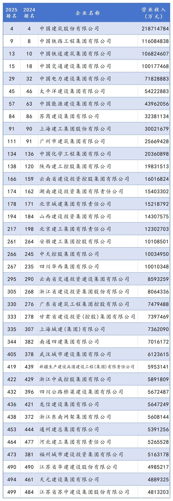 近日,中国企业联合会、中国企业家协会发布“2025中国企业500强”,该榜单以2024年企业营业收入为入围标准,入围门槛较上年提高5.79亿元,达到479.6亿元。经本报梳理,今年有38家建筑业企业上榜。